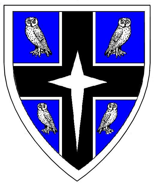 David Morteyne was a full rework from an attempt beforehand. The name was a simple change from what he had before to document what he wished, the surname was in place, and David is relatively easy to document. The trick became his device. The previous attempt was just blue (Azure) with four owls, now he is looking for the blue background, the four owls, the northern army star, and the cross line division with a white bordure. To me this became close to the complicated part of heraldry. Heraldry being what it is can be grand and colorful, and encompass all that you wish it to be, the more that you add to it, the more complicated it gets, and the more complicated it gets the more difficult to pass.