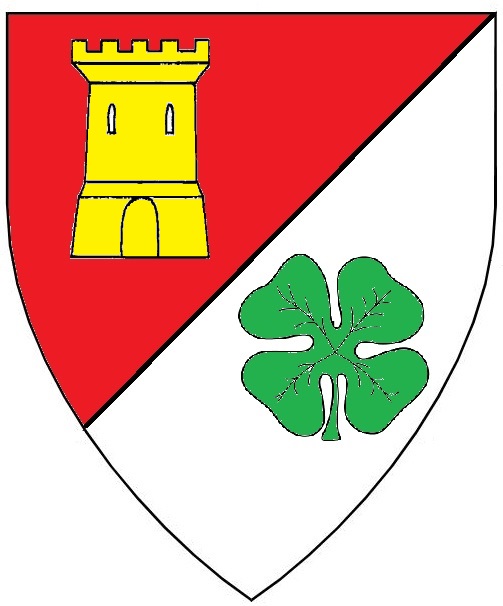 Per bend sinister gules and argent, a tower Or and a four leaf clover vert
